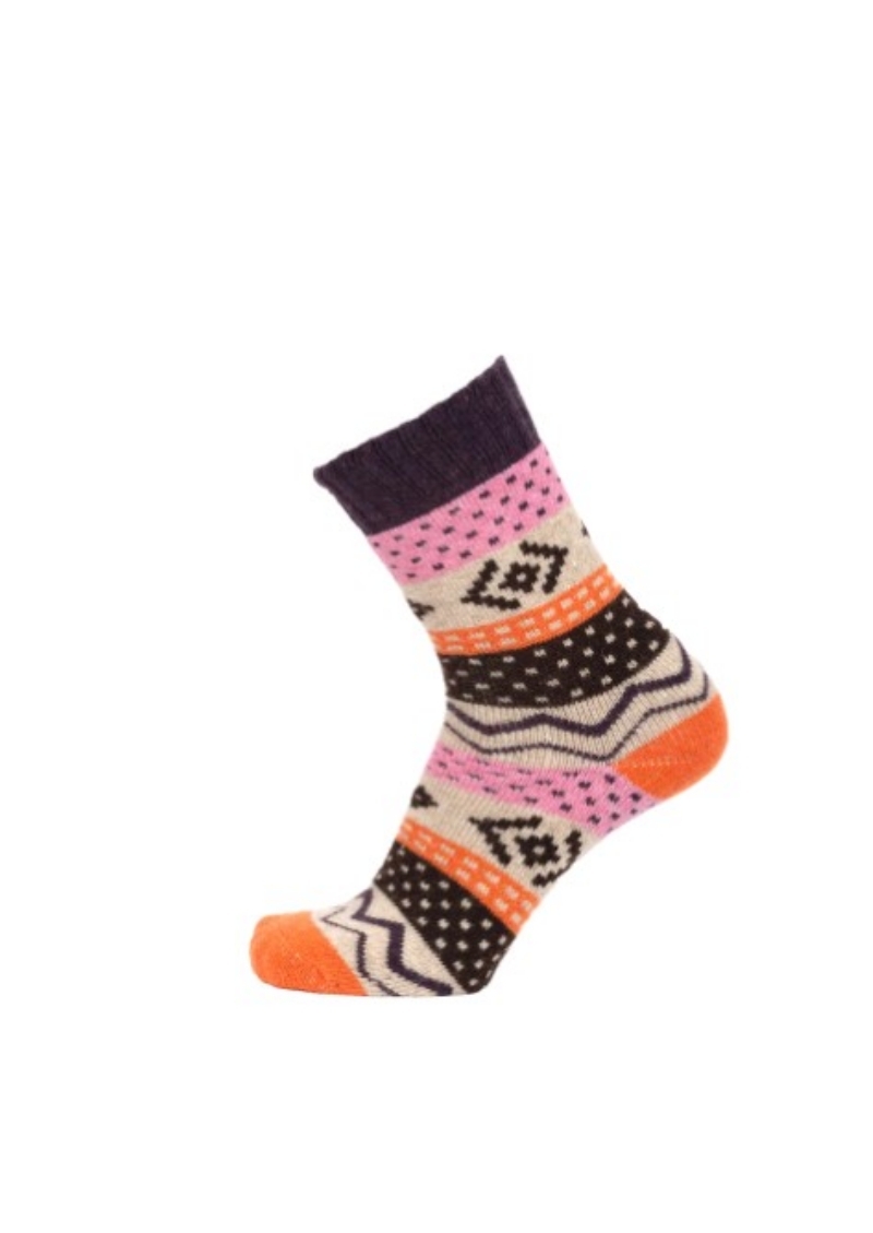 En rejäl raggsocka med vackert mönster, invändigt har strumpan en frotté som gör att den känns skön att ha på sig oavsett om du sitter framför brasan eller är ute och går i naturen